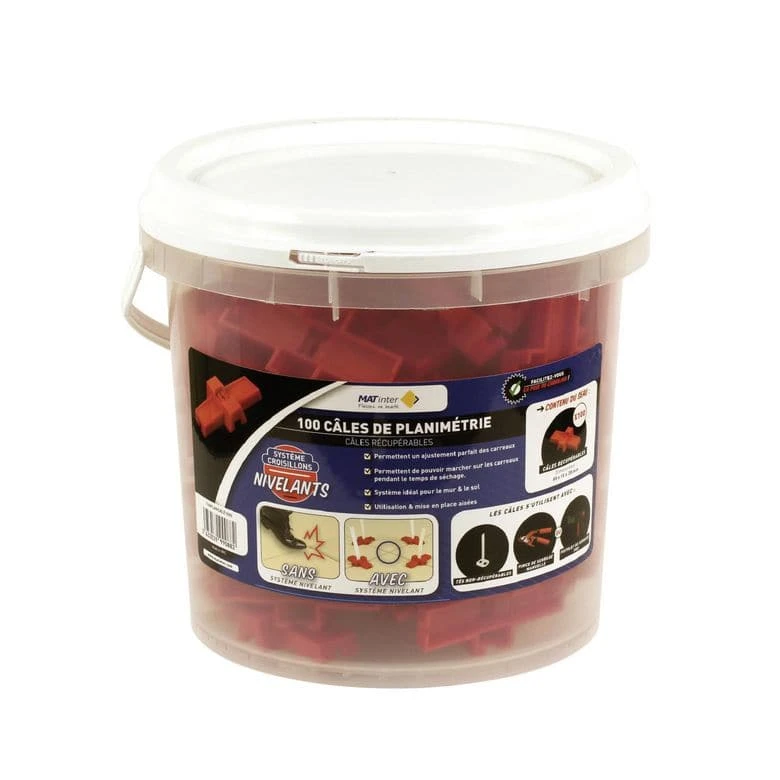 Un seau de 100 cales de planimétrie pour faciliter la pose des carreaux de carrelage et permettre un ajustement parfait de vos sols ou murs carrelés.