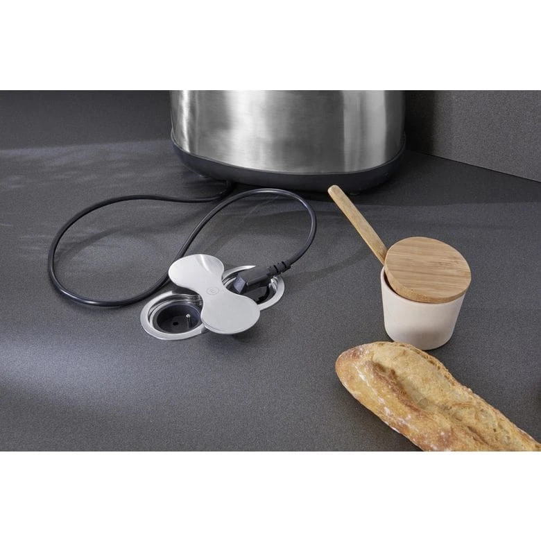 Le bloc forme 8 Push rotatif vous permet d’accéder à 2 prises sur simple pression rotative. Il peut s’intégrer dans un plan de travail.